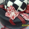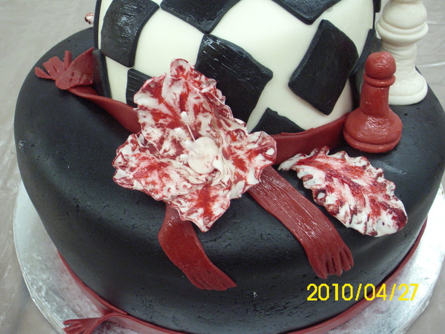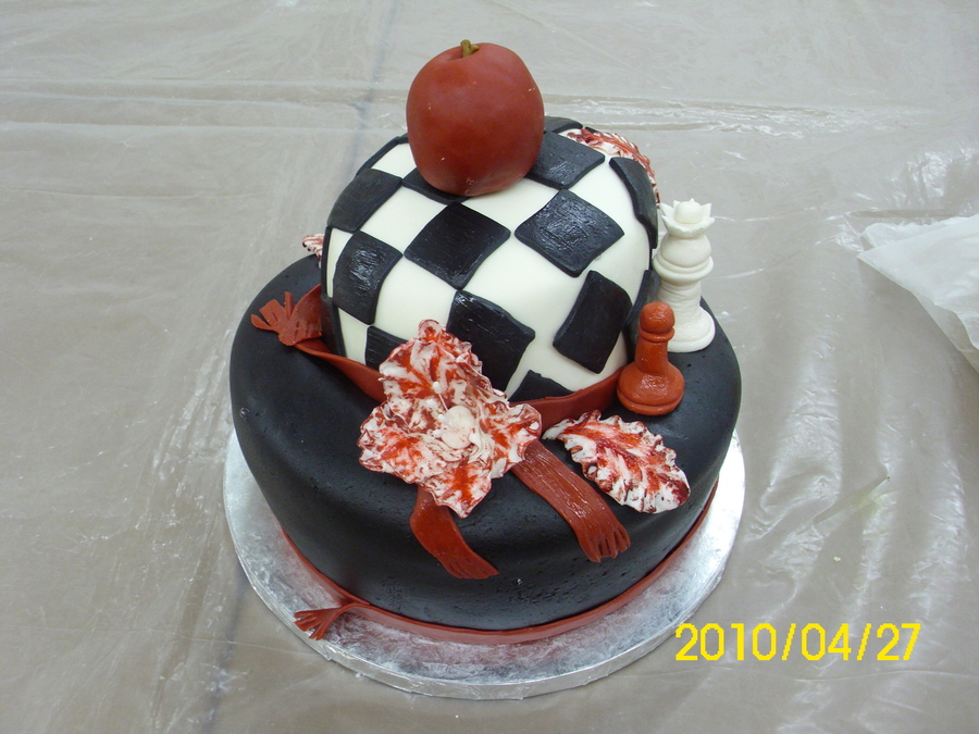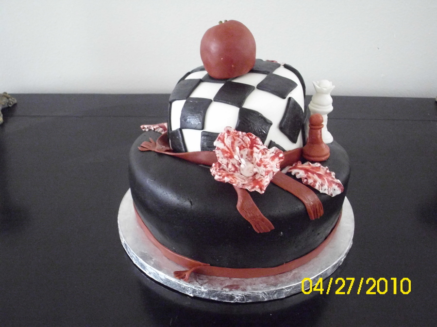 I got this idea from my favorite books, This cake has the cover from each book in the Saga "Twilight" series. It is a Topsy Turvy cake made from Fondant. The apple is made from Rice Krispies treats and covered in fondant. The chess pieces are made from gumpaste.