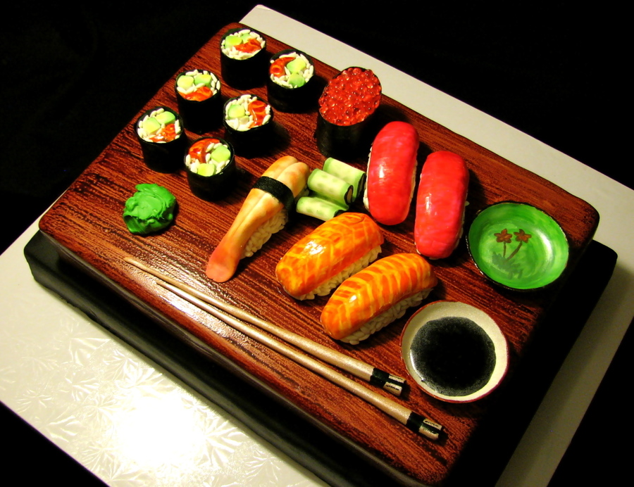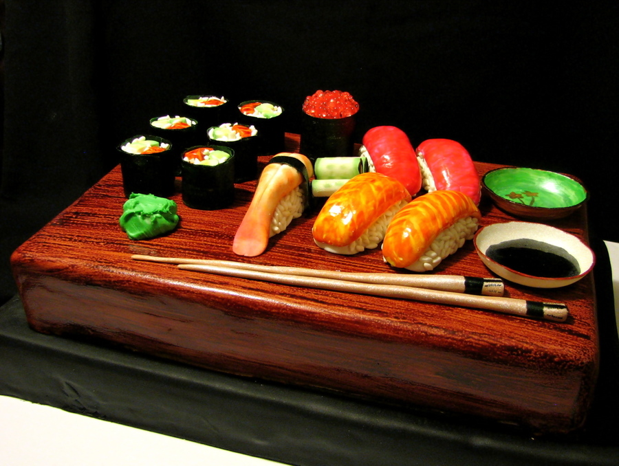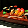 I made this for a grooms cake. He was a sushi lover...I am definitely not! It was a challenge...lol! All edible. Dishes and chopsticks are gumpaste. Seaweed is edible rice paper that I painted with green/black mixture of food color. Rice was made one grain at a time out of gumpaste. TFL!