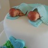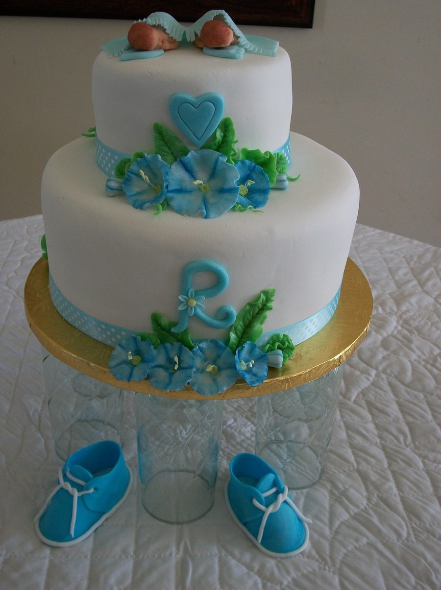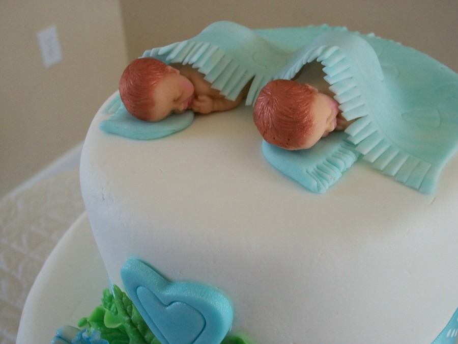 Baby shower Cake for a gal expecting twin boys. Mom and dad and big sister all have red hair!
