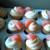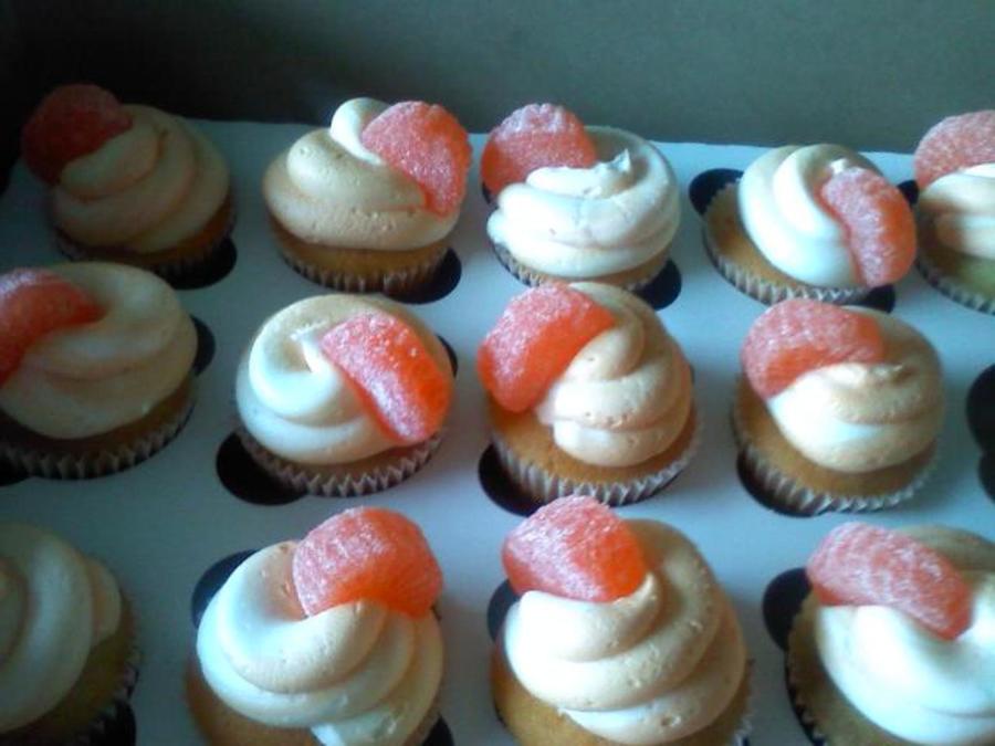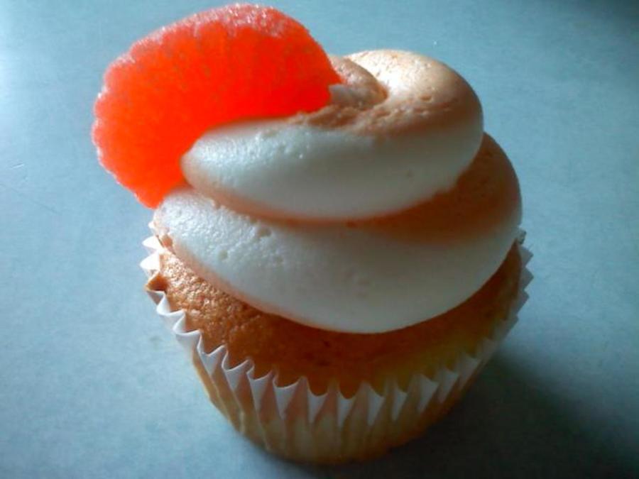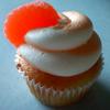 The cupcake is flavored orange and the frosting is cream cheese. Topped with an orange slice.