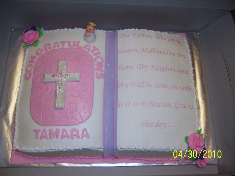 Vanilla cake with bc icing. Bc roses, fondant angel, and chocolate cross. Thanks mom for all your help!!