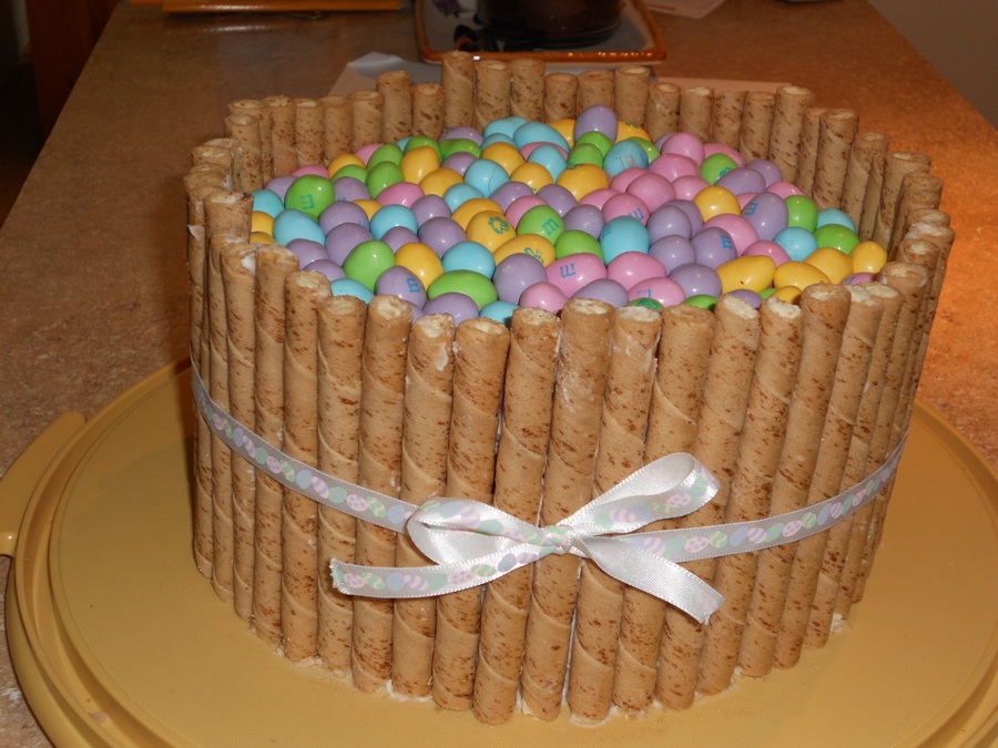 van/choc cake bc icing, raspberry filling, cookie wafers, peanut m&ms