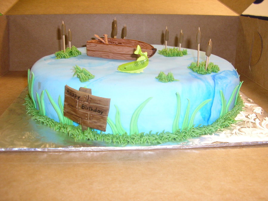 covered in marbled fondant, fondat boat, sign, cattails are toothpicks with fondant wrapped on end