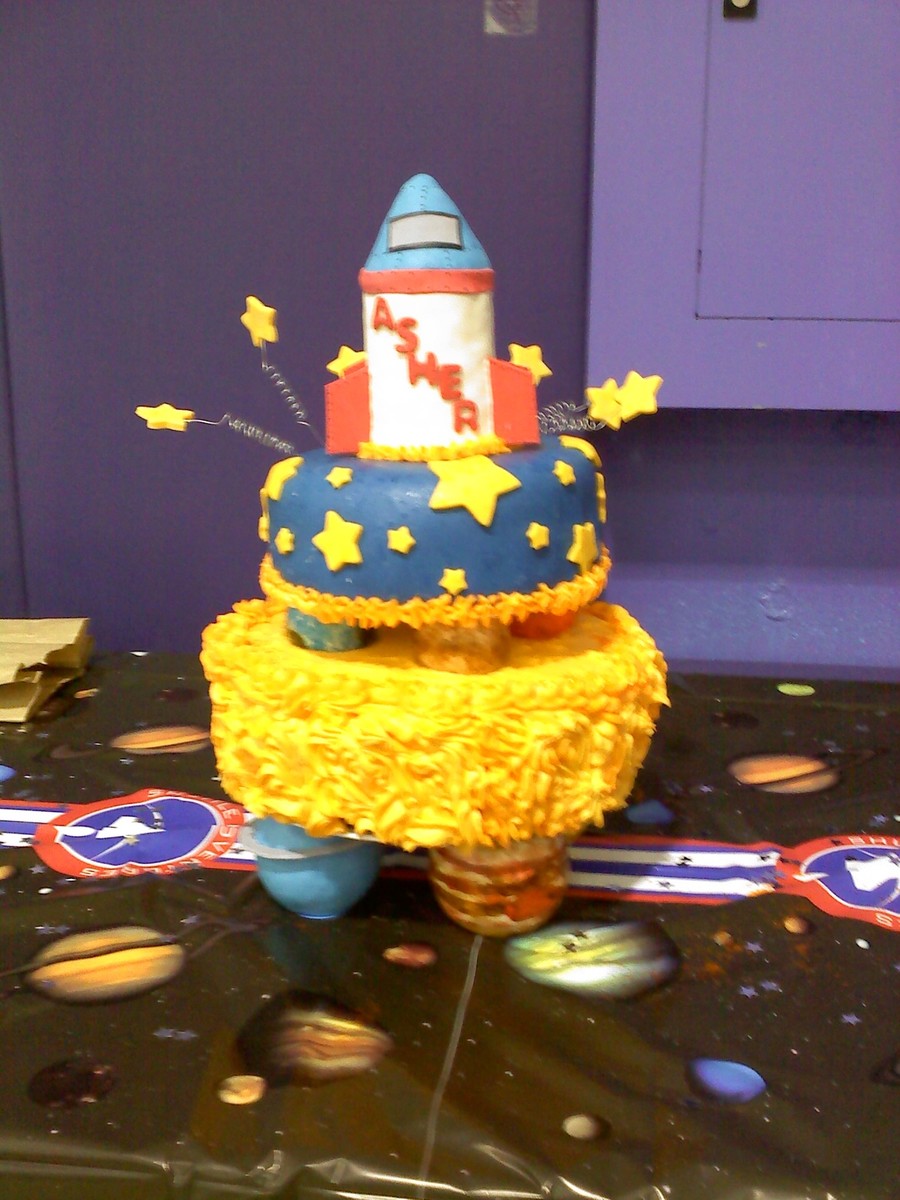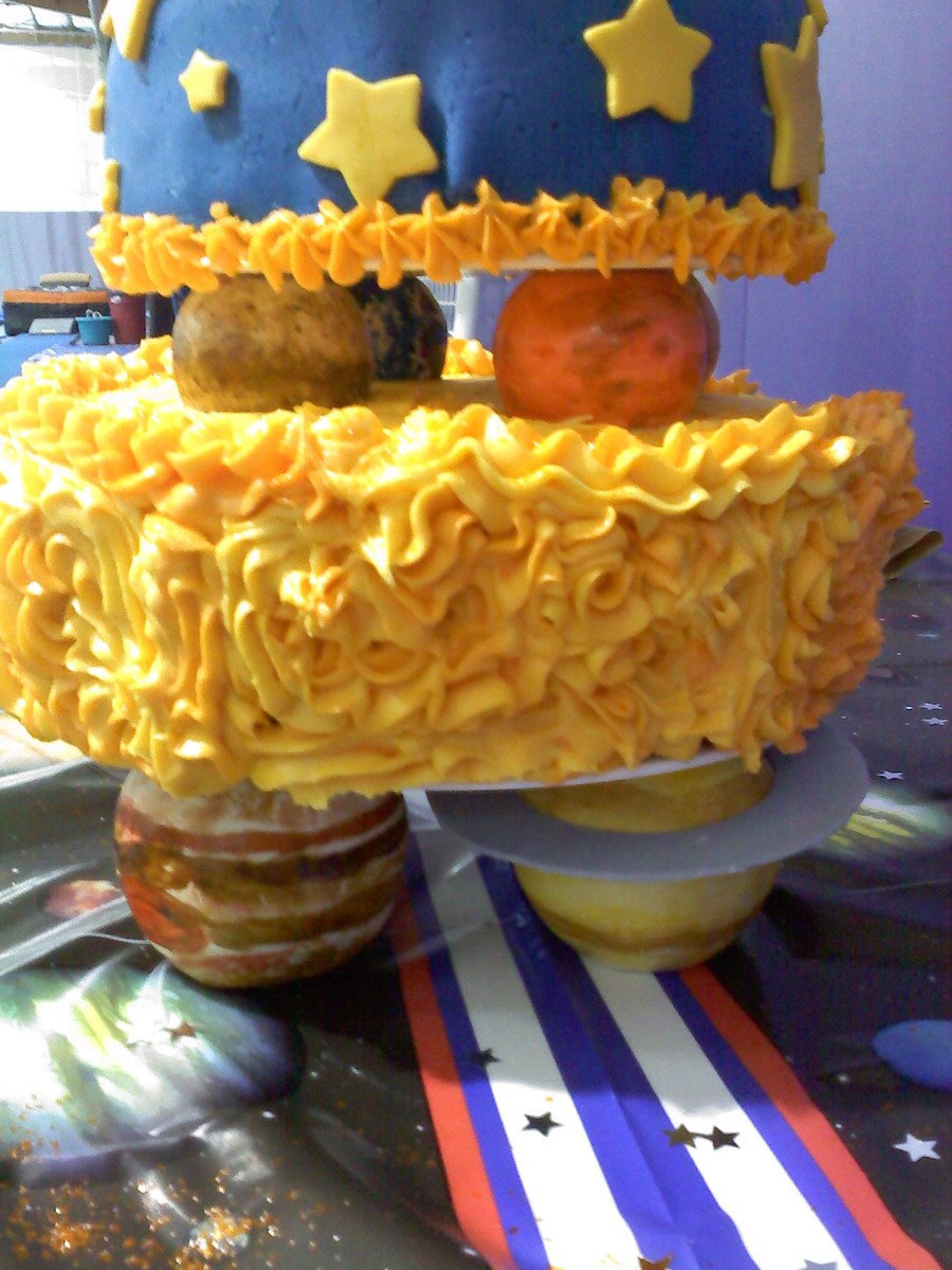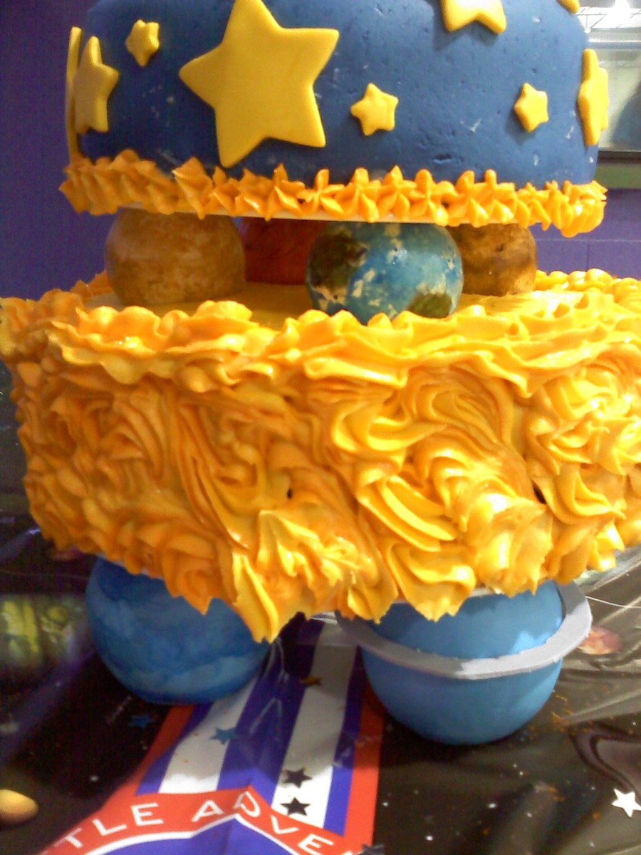 This was a birthday cake for my nephew. The bottom tier (sun) was a chocolate cake with buttercream frosting. The top tier was vanilla/strawberry cake covered with MMF. The rocketship was rice cereal treat covered with MMF. The 8 planets were covered with MMF as well. Inspired by SusD's outer space cake.