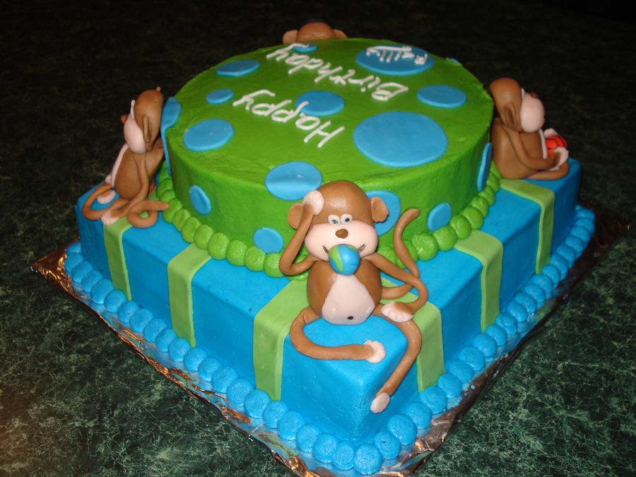 The birthday girl asked for a blue & green cakes with monkeys and stripes. Each monkey represents something about her interests.