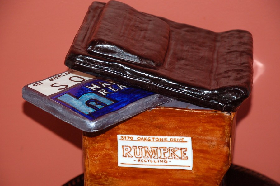 3 Layers of Lemon Caramelized brown sugar sponge filled with lemon curd, vanilla merigune buttercream and rasberry preserves. Covered in Fondarific butterceam fondant (best EVER), rice krispy lid, wheels and realty sign. Clients husband works for Rumpke and they were moving into new dream home...sign has old address and SOLD on it. TFL