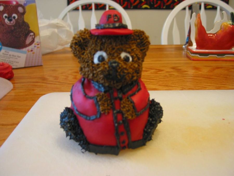 I made this fireman using the mini stand-up bear. The coat and hat are made from candy clay. The rest is buttercream.