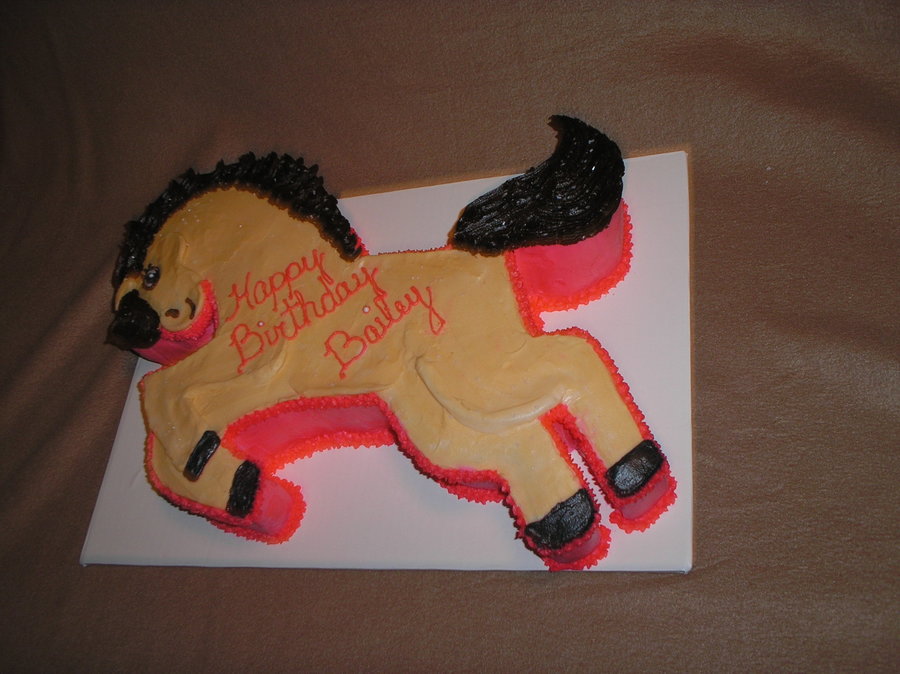 Large pony-shaped cake for a girl's birthday. All buttercream. Cut from a template made from an enlarged coloring book page. It was A LOT bigger than I realized when I was baking the cakes.