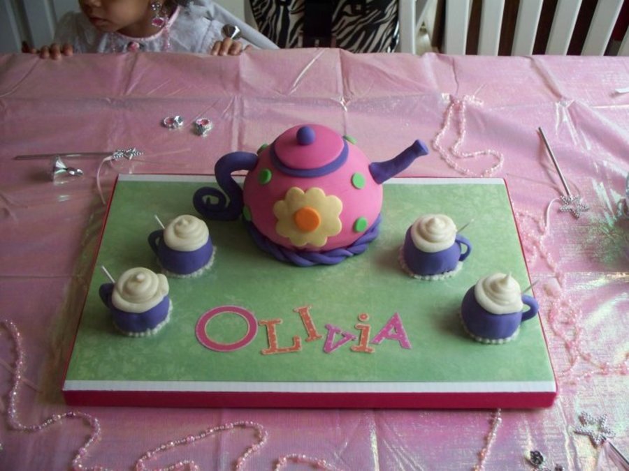 white cake with MFF...tea pot made with ball pan covered in MFF and cups are cup cakes covered in MFF.