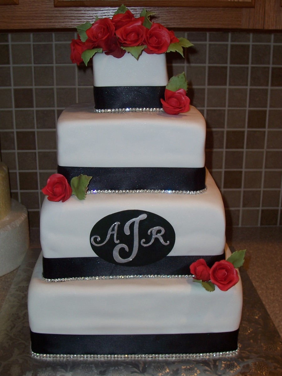 Red gumpaste roses and leaves. Black satin ribbon with a swarvoski crystal border. The monogram was done with my Cricut Cake!