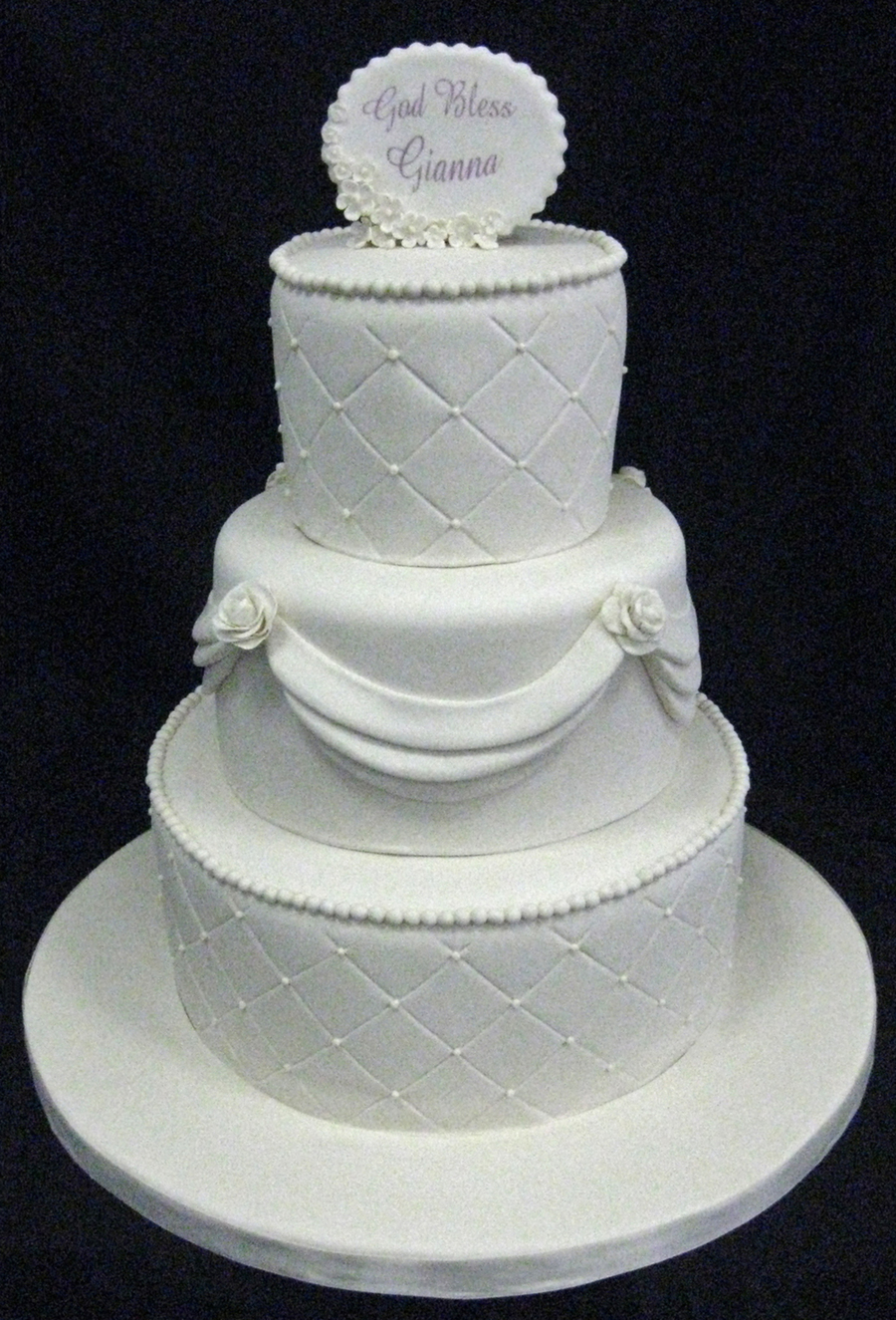 This cake was designed by the client....first time that I ever put swags on a cake.......LOL all fondant covered and fondant decorations....plaques on top is edible images... thanks for looking!