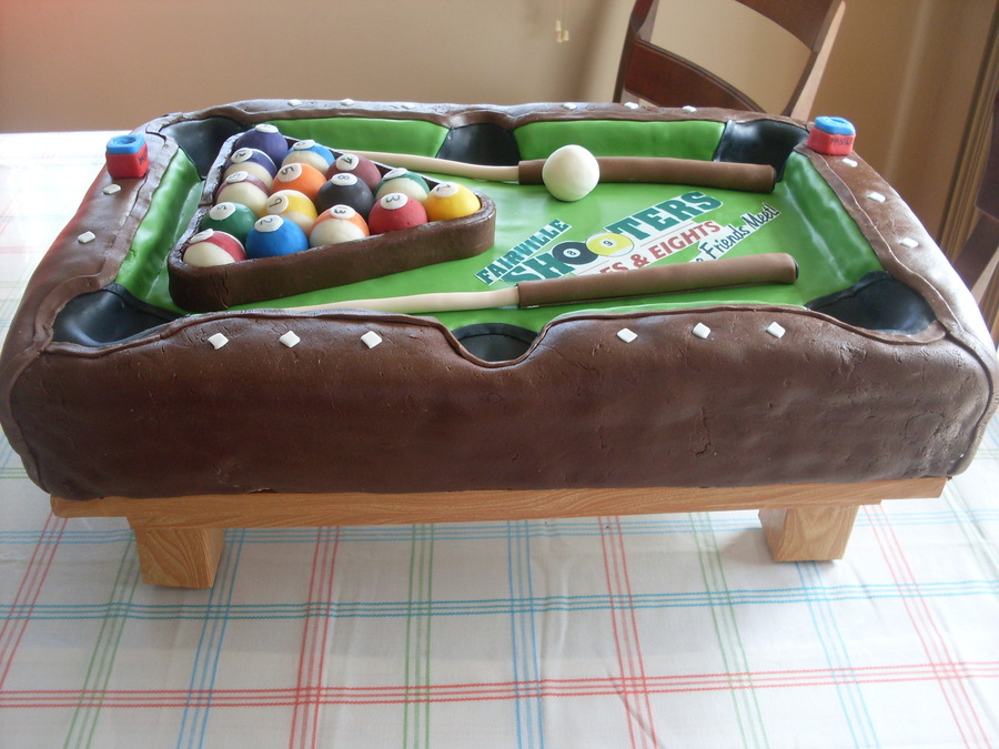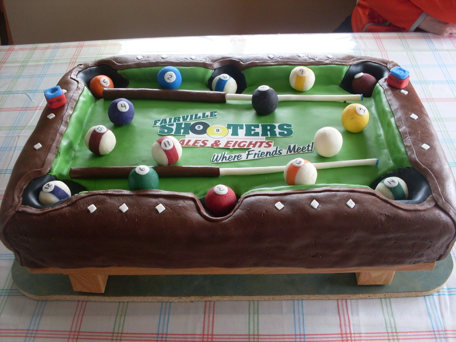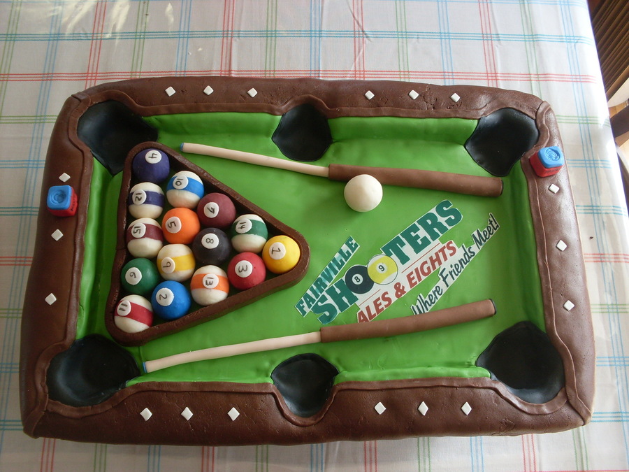 This was my very 1st cake all made with MMF, I made the balls out of melted chocolate and shaped everyone by hand, the cues and the rack were with choc MMF, the sign was done on edible paper, Chocolate MMF for the sides ( had a few issues with it not turning out too good) but some said it gave it a leather look to it. The felt was made with green mini marshmellows. Thanks for looking.