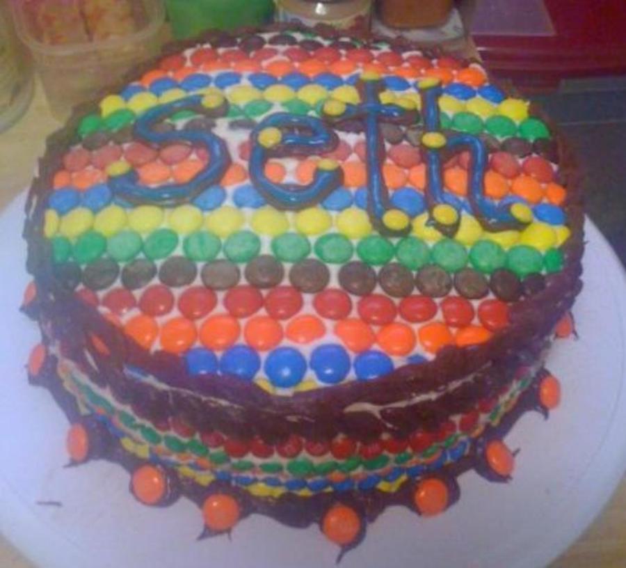 This is VERY sloppy, I know. But, that aside, I think it is a very cute concept. I made this cake for my three year old nephew. I had a surplus of M&M's leftover from Halloween, and wanted to "reduce, reuse and recycle" (lol). Its just a standard white cake with chocolate and vanilla frosting, covered in the candies. Next time, I will take my time.