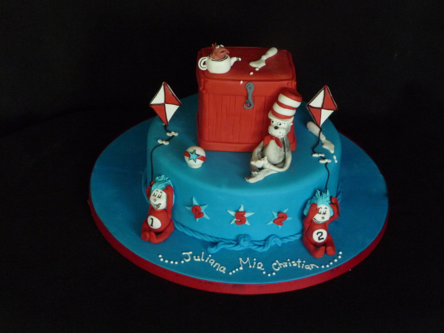Was asked to do just a Dr Seuss cake for twins and their older sister. I made the Cat In The Hat characters with the big red box ..this was so much fun!! A few probs but overall, I am pretty happy..they really liked it when I dropped it off this morning! Vanilla cake with chocolate SMBC icing covered in fondant..everything is edible except for the lollipop sticks holding kite and used as support. Thanks for taking a peek!