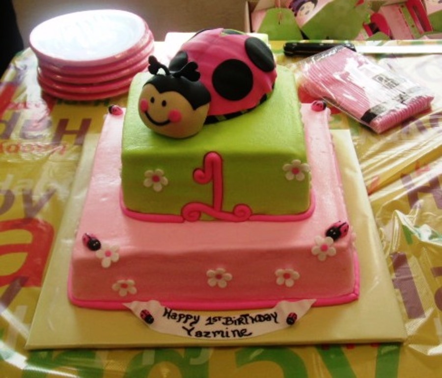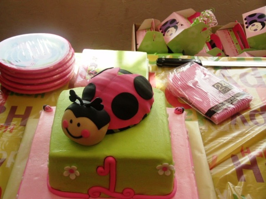 I made this cake for a little girl's first birthday. The disign is based on the plates the mother picked, as well as a cake made by pinkcakebox. The big ladybug is made of RKT. I made the tiny ladybugs using Aine2's tutorial on youtube, I am really happy with the way this cake came out.