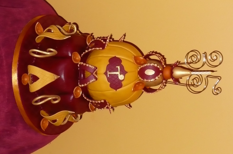 My third cake and semi-happy with it. (It was supposed to look like a dome, not a pumpkin.) Inspired by a few gorgeous cakes I saw on Cake Central. Made it for my best girlfriends 35th Masquerade Birthday party. It took a lot of time. Made everything from scratch. Cut all of the shapes by hand. Homemade marshmallow fondant, 6" Wilton ball cake pan, 8" round cake cut into petal shape. Mixed Tylose powder & MMF to make the shapes. First (and probably last) time piping - had the stupidity to color the RI orange, instead of yellow - hence the messy work and 4-5 coats of luster dust. Base: 2 yellow cake layers soaked with Kahlua + cream cheese filling on top of 2 chocolate layers + raspberry filling. Ball: yellow & chocolate haves + cream cheese filling. Buttercream icing under fondant.