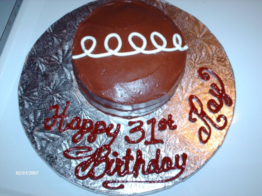 I made this for my husband's birthday. It is a 6inch chocolate fudge cake with chocolate mousse filling and chcolate fudge icing. My husband was out of town and he joked about not having a cake on his birthday, so he was going to buy a hostess cupcake and put a candle in it. Well, much to his suprise, I arrived at his hotel with a "Hostess Cupcake" Cake and a half gallon of milk! He LOVED it!!!