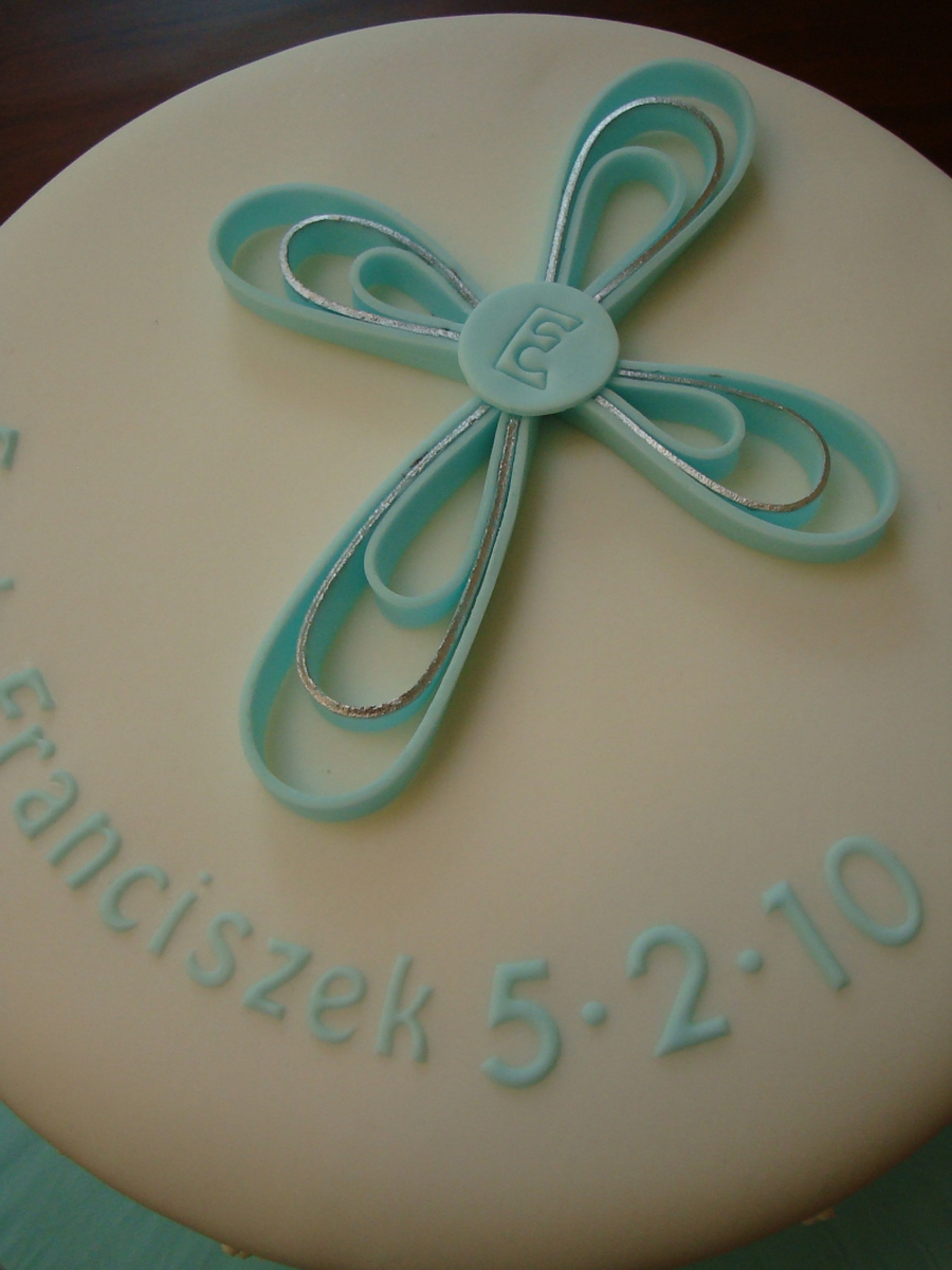 Little boys baptism cake. I handmade the fondant cross then painted the silver accent on it. The cake is covered in white fondant but it looks ivory in the picture.