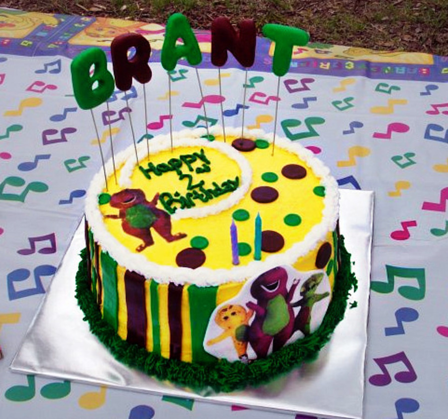 barney cake. edible images with gumpaste letters on floral wire. Fondant circles and piped BC gras
