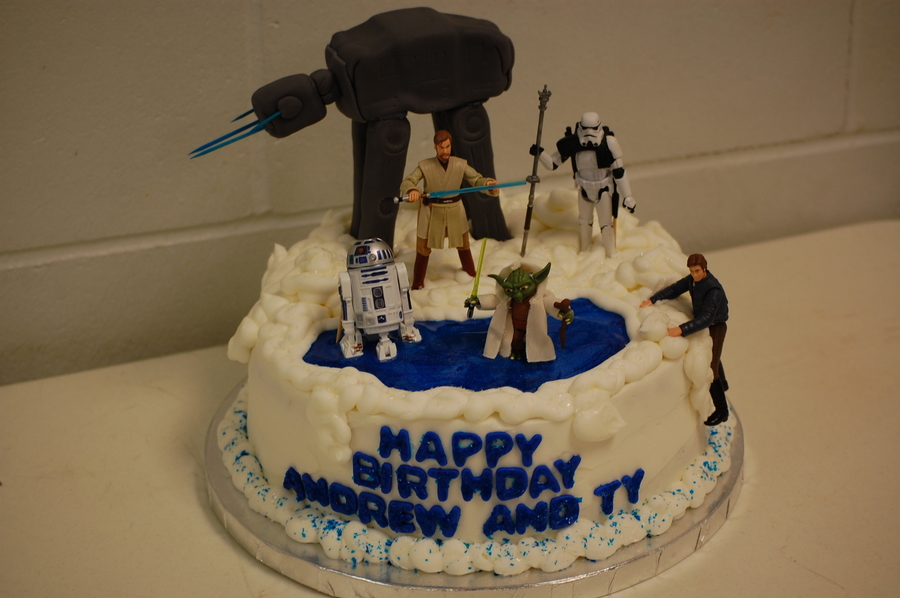 The cake is iced in buttercream with cake sparkles on it to look icy. The characters are skating on sparkle gel. The boys had a skating party but also liked Star Wars so that is why I had to include the skating... The figurines are plastic but The At-At is made from pound cake and covered in fondant. The legs are fondant covered clothes pins.