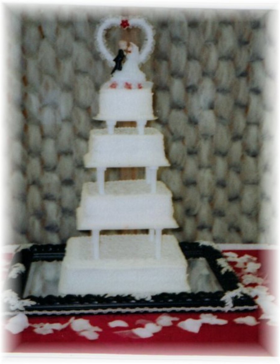 14, 12, 8, 6in tiers, all buttercream...buttercake. Made some really pretty red buttercream roses to go in the corners...but the bride decided she liked it better plain. It was covered in sotas...hard on the hands...but beautiful effect.