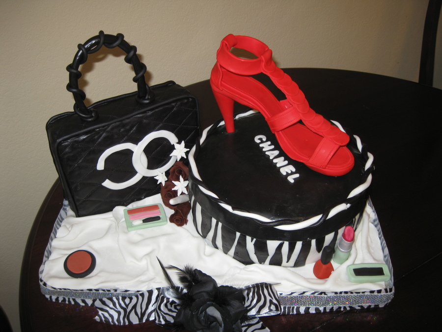 The Chanel purse is made out of RKT and the round one is the cake. The shoes is made out of fondant with lots tylose powder in it. The make-up is made of fon/gum.