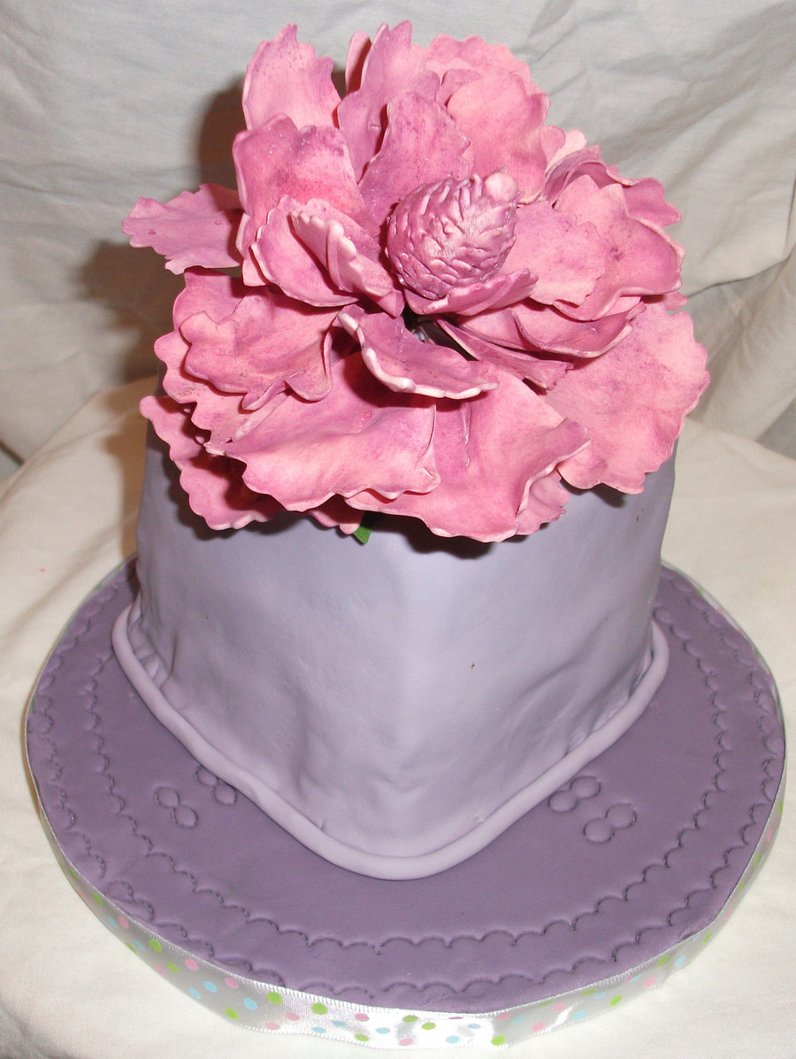 This large fuschia-colored peony sits atop a violet fondant covered cake. Crimpers were used to decorate the cakeboard.