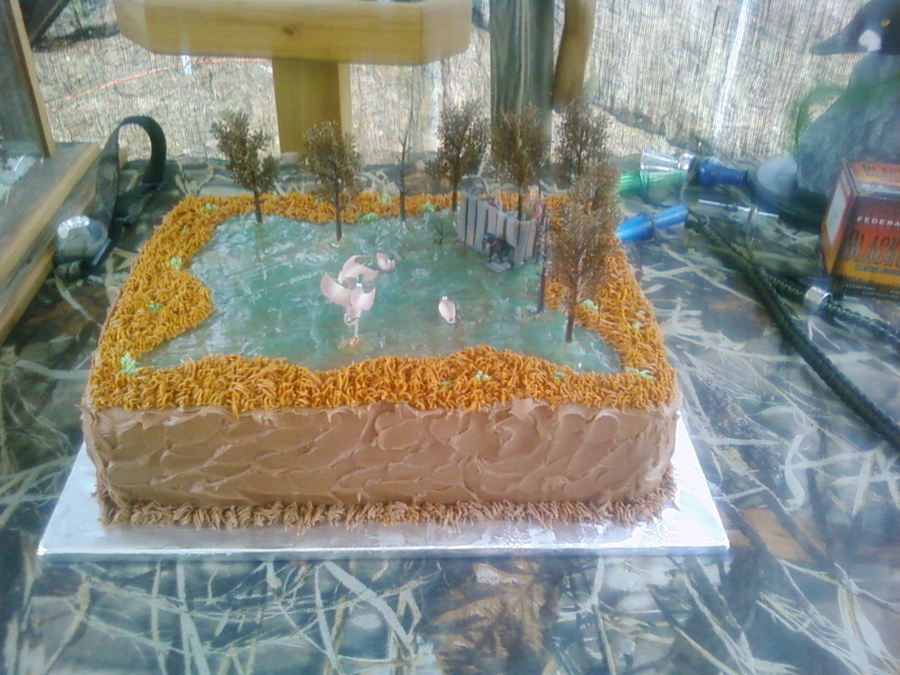 two 11x15 chocolate cakes soaked w/ rum syrup with raspberry chocolate ganache filling. Chocolate buttercream on outside, we colored piping gel for water. Ordered the ducks, dog and hunting men from the toy dept of amazon.com. The duck blind is made of fondant.