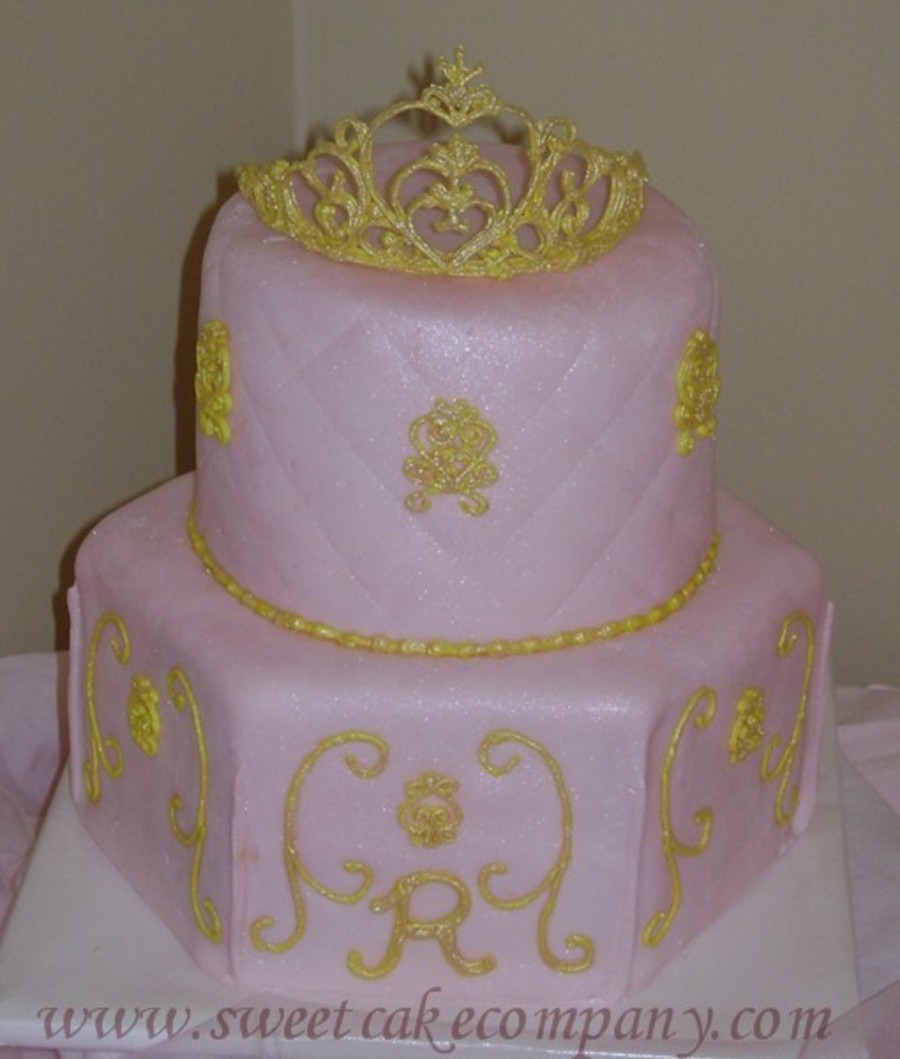 I created this for my daughters first birthday. Covered in pale pink fondant brushed with super pearl and orchid pink. Crown was royal icing. I got the template for the crown here on cake central.