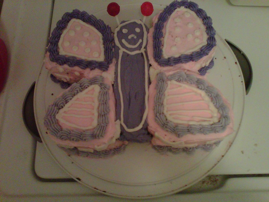 I used a 10 inch round cake for the wings and cupcakes for the body. The icing is vanilla buttercream.