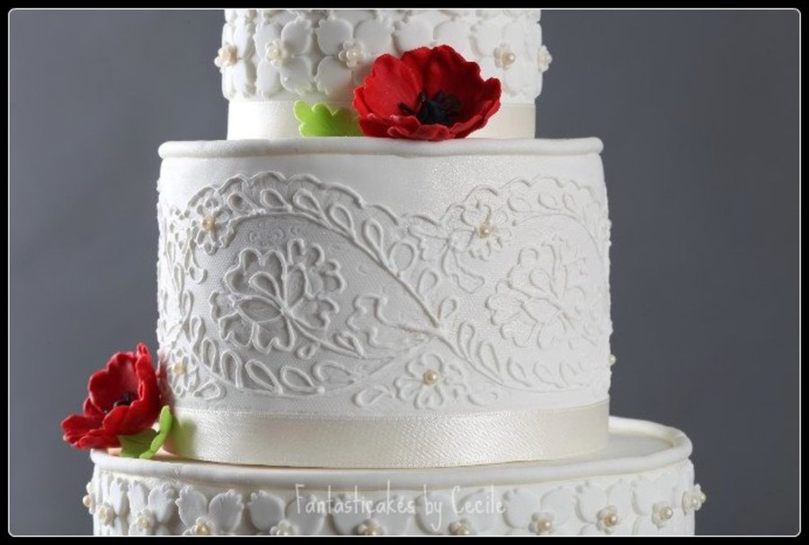 This the wedding cake I made for the wedding cakes issue (n.2) of Cake Central Magazine. The magazine is amazing, I love it so much! I had to make a lace cake, but NO lace mould at home!! So I had to create my one lace decoration, with a real lace I found here in Italy, used for wedding dresses. It was very excinting, even if I was a bit nervous....!