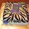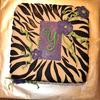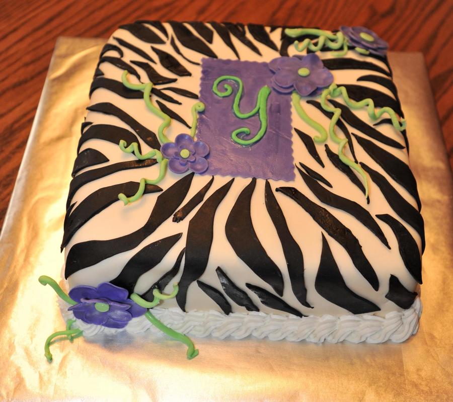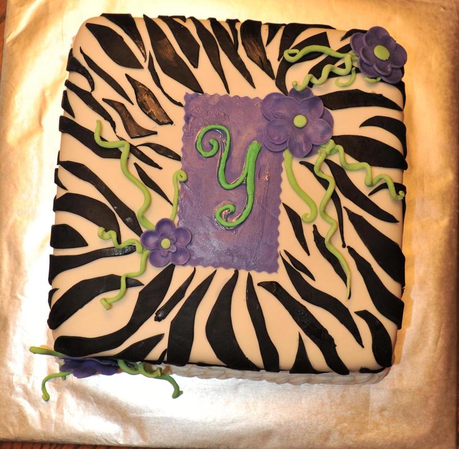 My first zebra cake. I covered cake in fondant, made the tag, flower and stems from gumpaste. The initial is in royal icing.