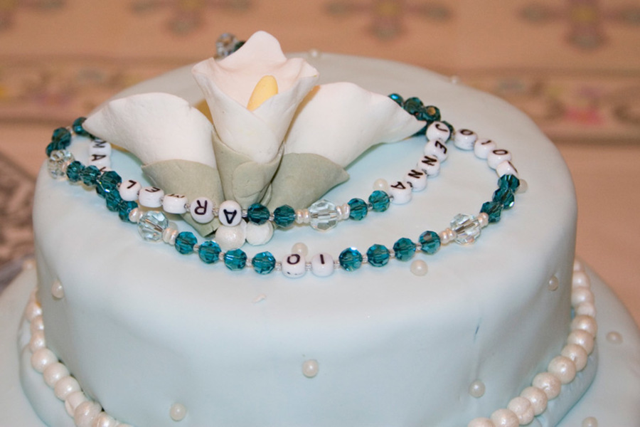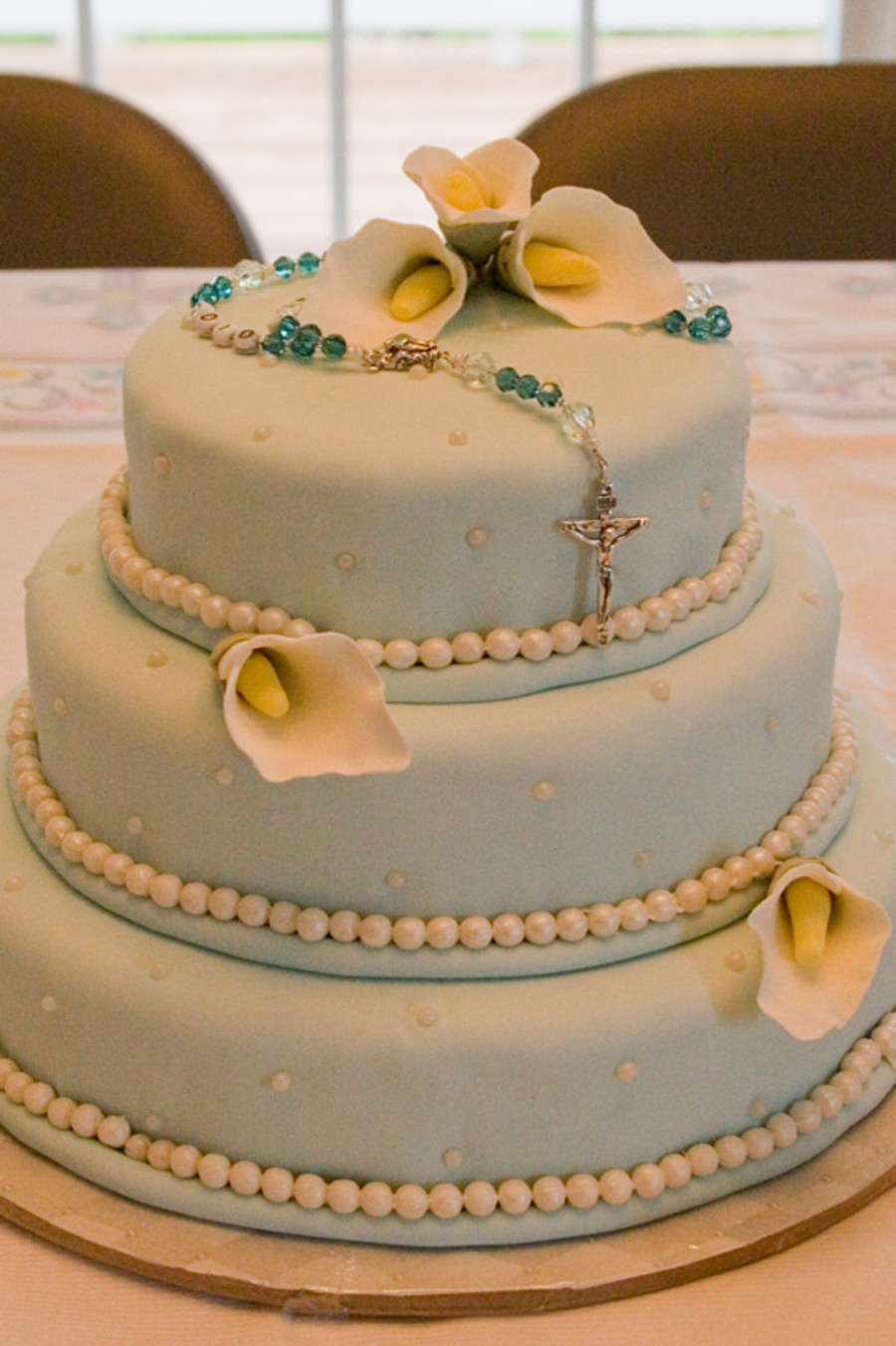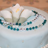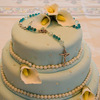 I helped a friend make this for her daughter's first communion - it was her first fondant / gum paste project! Blue fondant with gumpaste calla lilies and strands of gumpaste pearls.