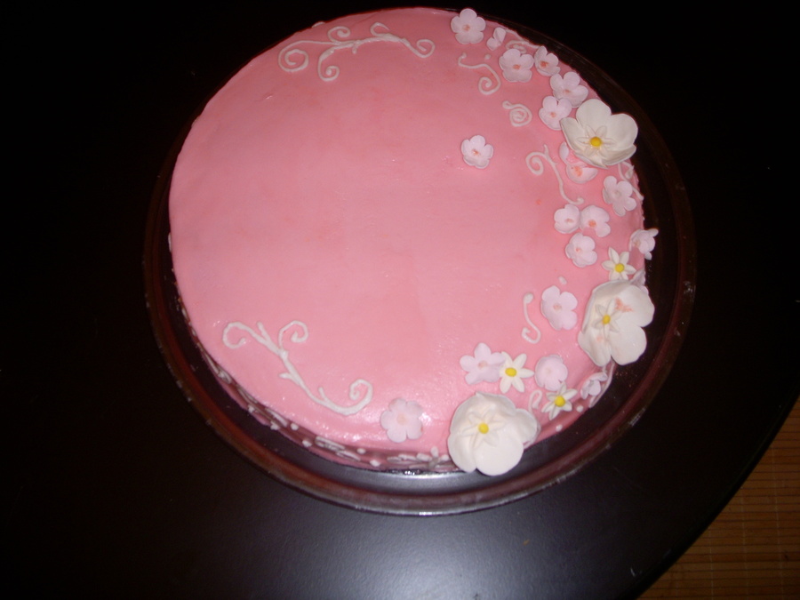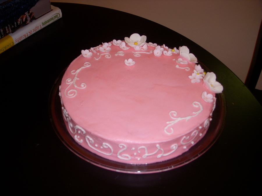 I've never made a cake on a rainy day before and so I didn't think anything about it. Well it started "melting" but other than that I thought it was cute :) It's all buttercream with gumpaste flowers. Pink lemonade cake with pink lemonade filling. Oh, and my first try at scroll work.