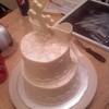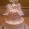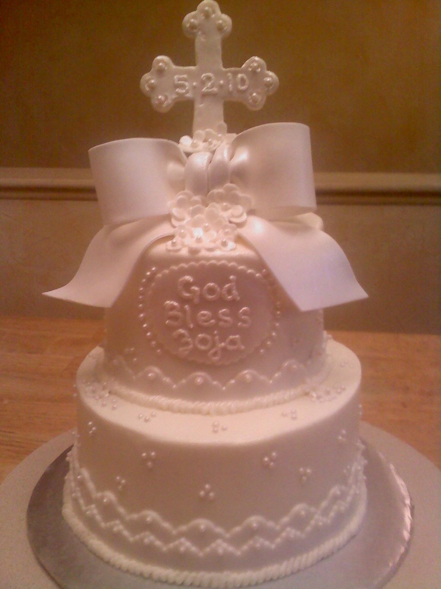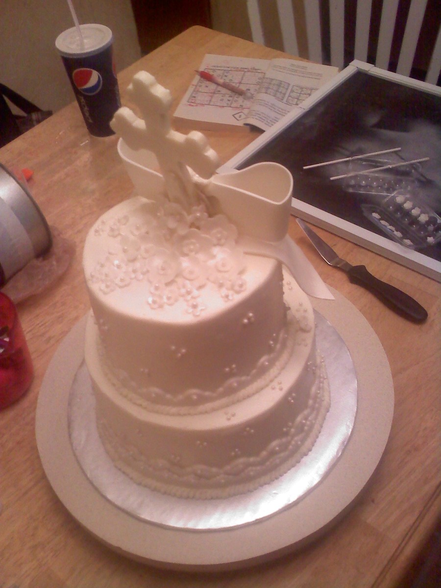 Top Layer Butter Cake, Bottom Layer Dark Chocolate. Both with 3 layers of fresh strawberries & cream filling. Butter Caramel BC with fondant/gumpaste accents. Cross was White Choclate. Edible Pearls & Shimmer sprayed.