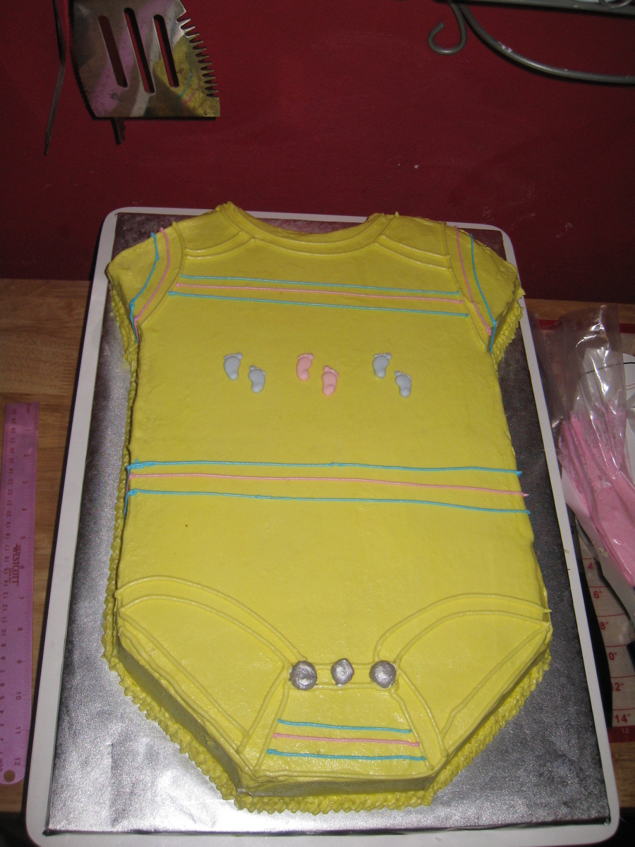 A onesie cake carved from a half sheet cake. Decorated in buttercream with little sugar lay-ons for the "feet"...the mom-to-be is expecting triplets!