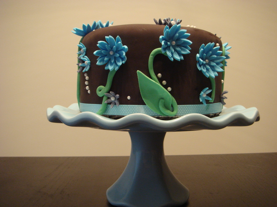 Most of the cakes I've been doing lately are inspired by several cakes that are in my favorites. This one was largely inspired by Mug-a-Bug's Ladybug cake. It was a strawberry variation of the WASC recipe (which turned out wonderfully) with a hazelnut fudge filling and chocolate buttercream. It was covered with Satin Ice's Dark Chocolate fondant and fondant decals. I also used Wilton's sugar pearls. My new favorite I think!