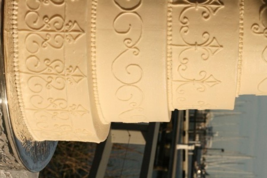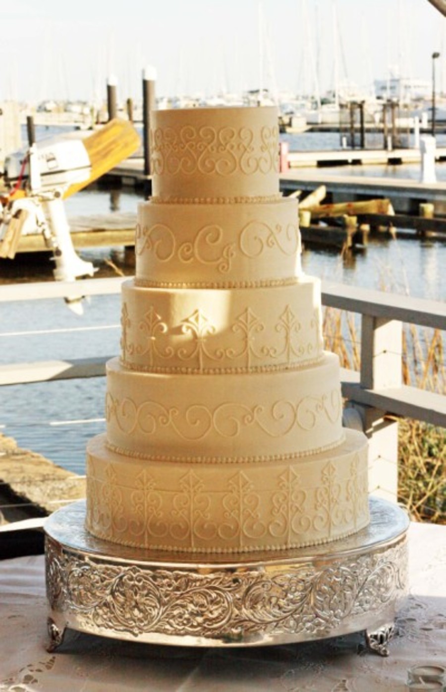 This 5 tier buttercream wedding cake is a 14, 12, 10, 8 and 6 inch. The scroll work was inspired by the gates surrounding the Citadel Military College of South Carolina.