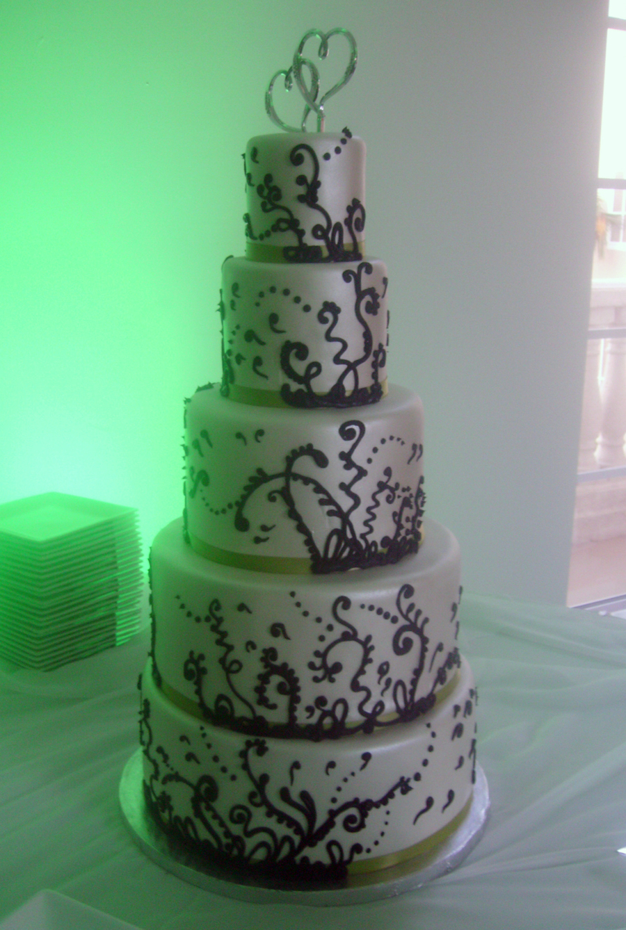 Pearlized marshmallow fondant over dark chocolate cake with black royal icing