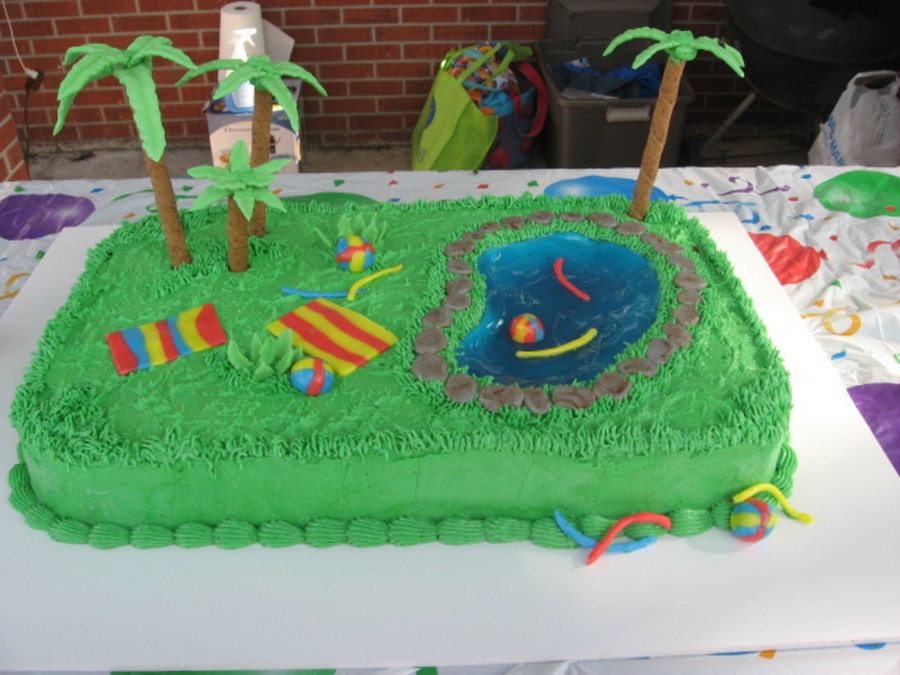 I made this for my nephew's pool party. It is BC frosting with piping gel for the water. The trees are royal icing. The pool toys and rocks are fondant.