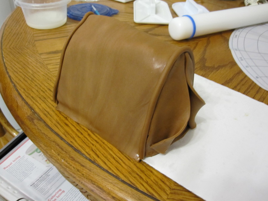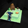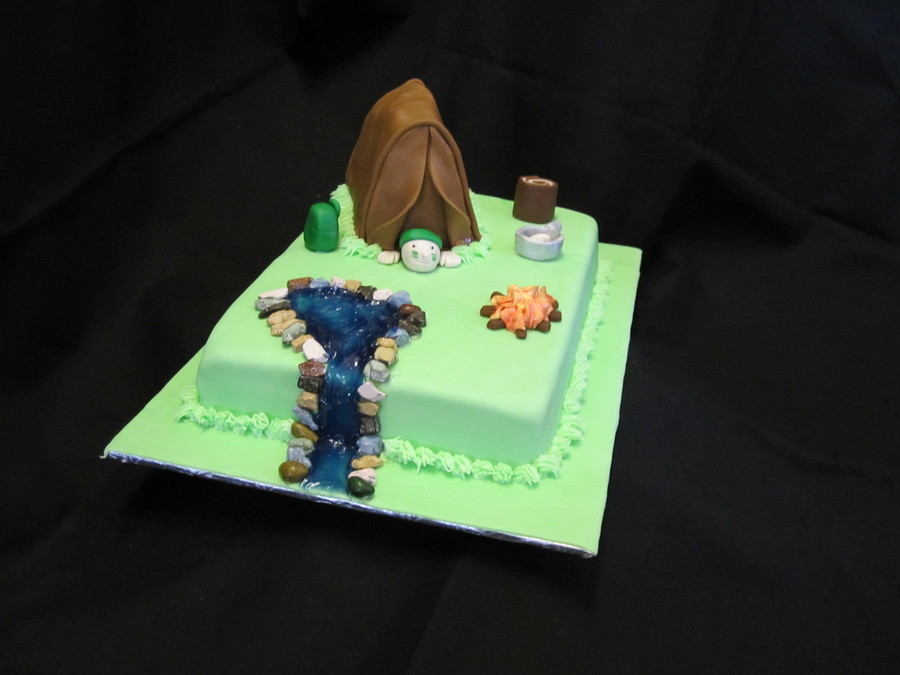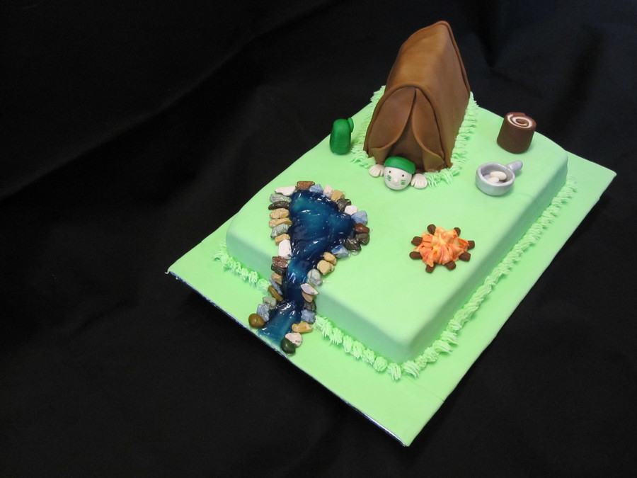 french vanilla cake with icing filling tent is made of cake - all covered in fondant fire, pot, stump, back pack and man made of 50/50 gumpaste and fondant
