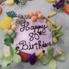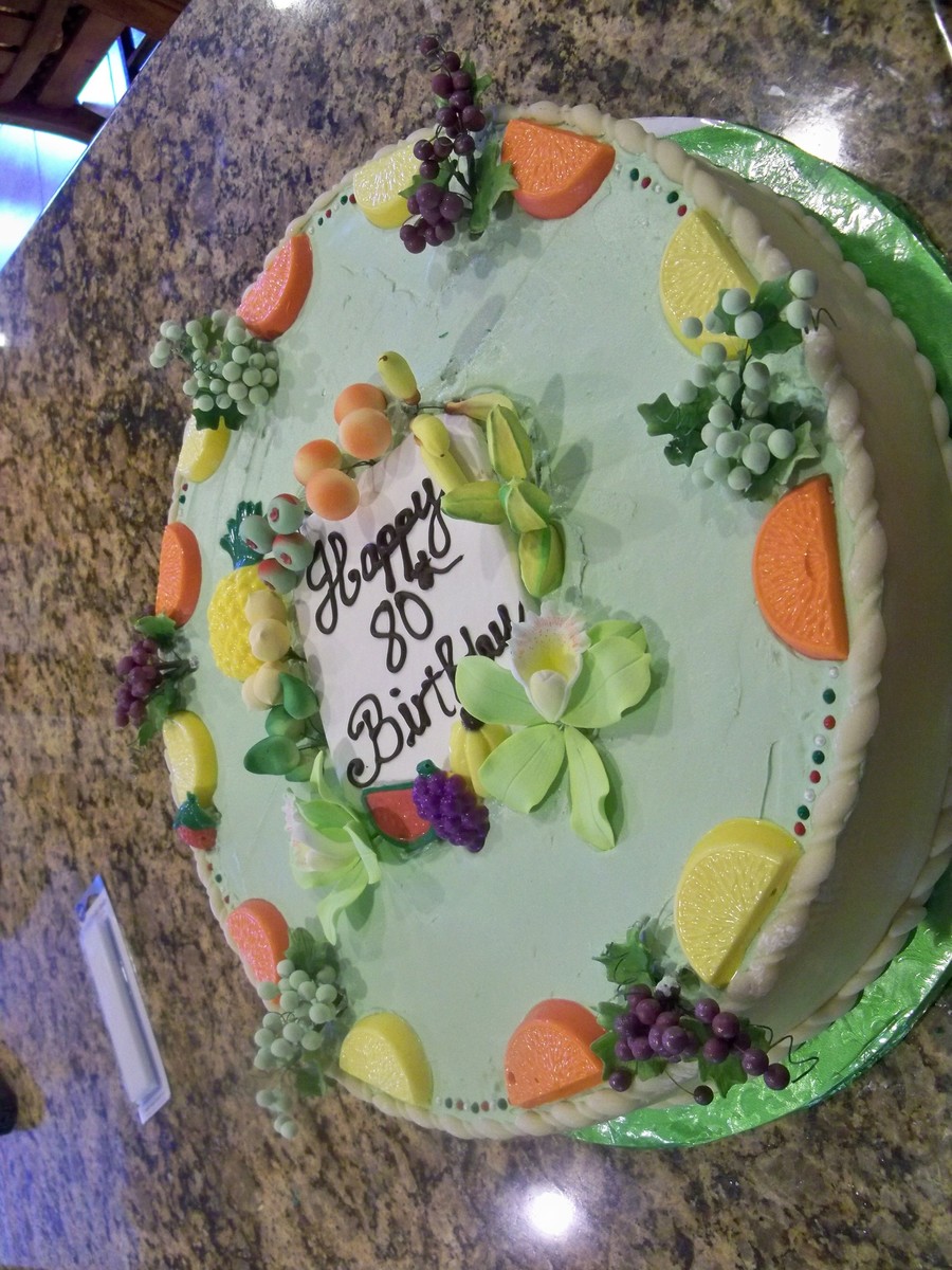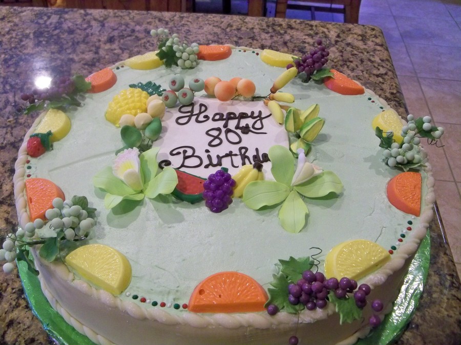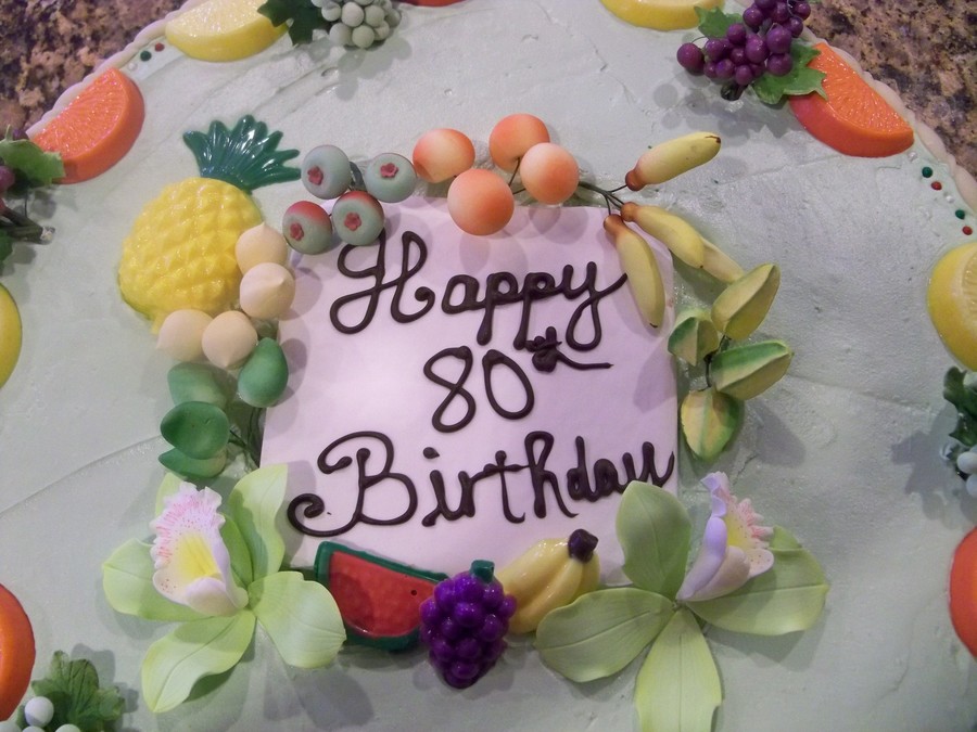 This cake was a challenge! I made it for my husband's grandfather's 80th birthday party. My in-laws are Sicilian and I wanted to do something traditional. I decided to make a Cassata alla Siciliana which is basically an Italian cream cake with cannoli filling. The cake itself was 18" in diameter and a little over 4" high. I iced the top of the cake with a basic sugar icing and I covered the sides with Marzipan. The most of the fruit is made out of chocolate along with the "happy birthday" plate. The grapes/flowers are gumpaste. Needless to say after all the stressing out I surprised even myself! Not too bad since I just started "baking" 6 months ago. I hope you like it.