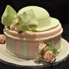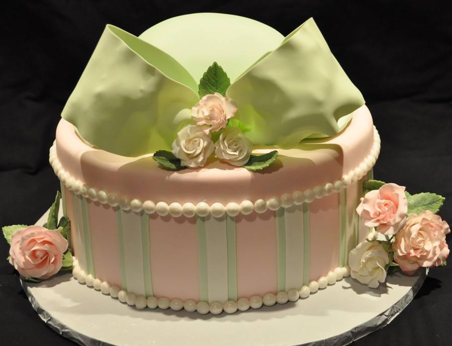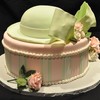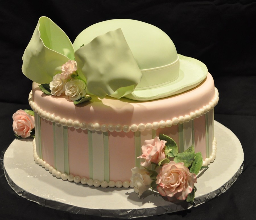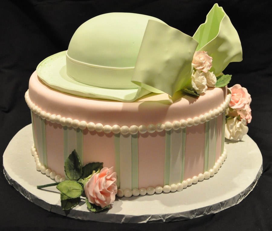 This is an almond sour cream cake with raspberry filling. The hat is also cake. Made for an lady turning 85. Gumpaste roses.