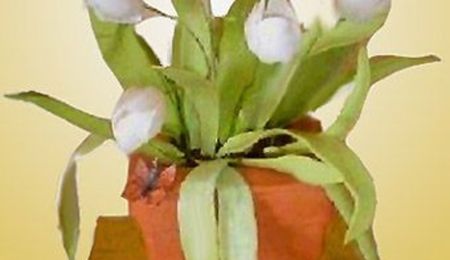 3 Tier sponge cakes, covered with white fondant. The pillar is a candlestick holder, with the spike removed from the top, to allow the top tier to sit. Internal small plastic rods were inserted for support. The flowers are silk.