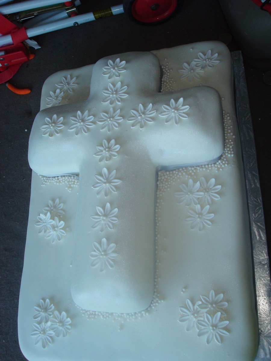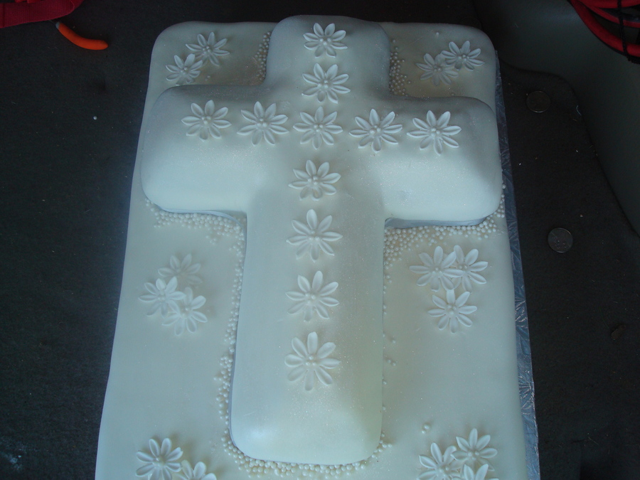 I had a woman order a cross cake but she wanted it for 60 people. AGHH! I used the Wilton cross pan and covered it in MMF. I also made a sheet cake and and covered that in MMF. the cakes are bordered with a silver ribbon, and dusted with white shimmer. I then used gumpaste daises for additional decoration. I also used Wilton's new ball sprinkles and attached them to the sheet cake around the cross.