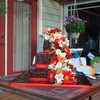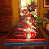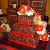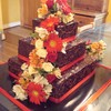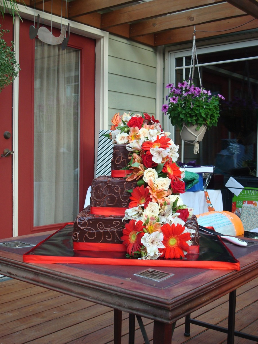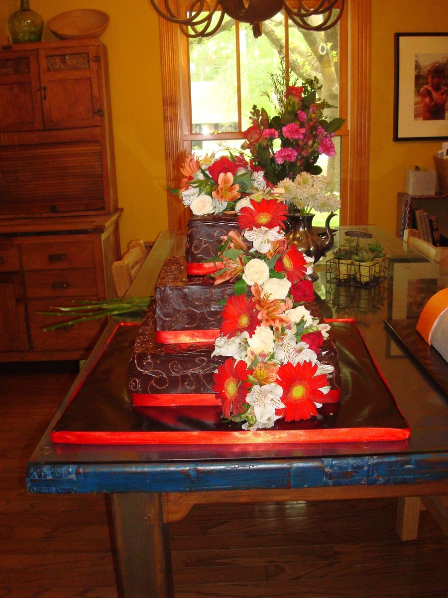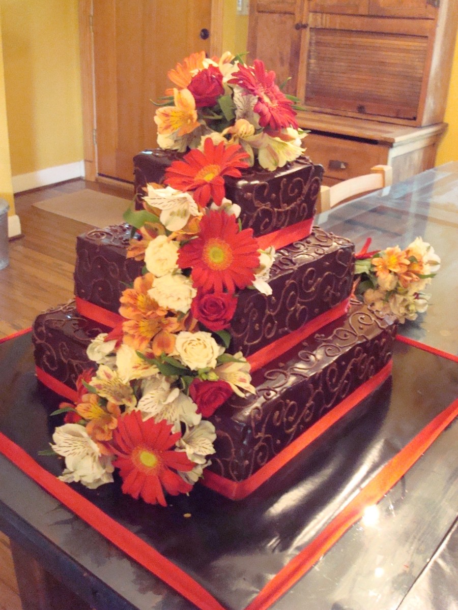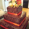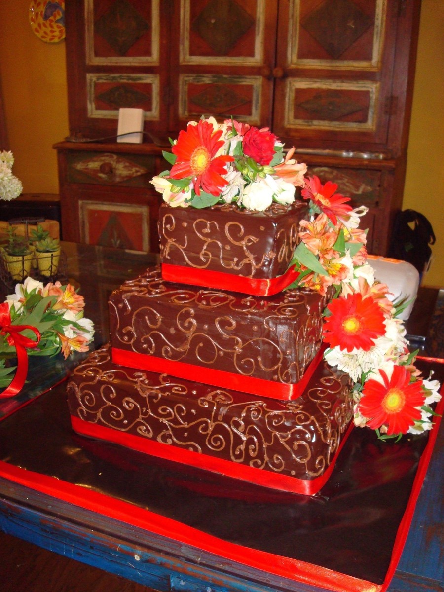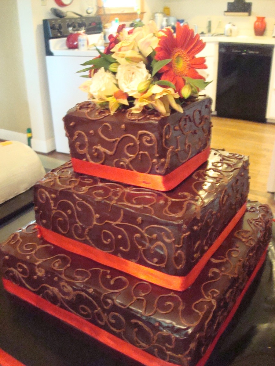 This was my first wedding cake and first ganache cake. I made this as a gift for a dear friend of mine who was finally marrying her long time beau. The bride wanted a square cake with chocolate ganache with fresh flowers. I had practiced and practiced and finally got the technique down. When it came time to ganache the actual wedding cakes go figure I can't get it smooth for the life of me! I don't know what was different about that time, but it just wouldn't work for me. At this point it was getting to be sorta late and if I was going to make and design changes I didn't want to do it without the Bride's permission. At 10:30 the night before her wedding I have to say she was surprisingly calm about me telling her the cake so far looked like crap! At that point I decided it was time for me to learn how to pipe scrollwork. Thanks to a lot of cakes on CC and google images I was able to figure out the basic principle behind scrollwork. A little bit of practice in my sketch book and on the counter with the whipped ganche and voila'! Scrollwork! As for the fresh flowers I have never arranged one in my life. 30 minutes (thanks to stand still traffic on the freeway for about 2 hours) before wedding we show up and I still have to assemble the top tier, do the scroll work, arrange the flowers. AAAGGGHHH! As you can see from the picture I was able to complete it and I still got to see my friends get married!