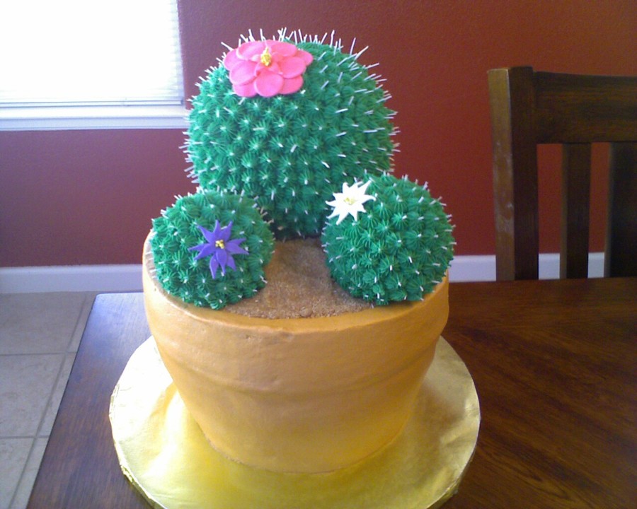 Cactus cake made for a teacher appreciation luncheon on cinco de mayo. The pot is chocolate cake with a chocolate ganache filling, and the cactus is RKT. I used the buttercream dream icing recipe found on this site, royal icing for the spikes, and fondant flowers. My yummy sand is made from graham crackers, brown sugar, cinnamon, and "sugar in the raw".