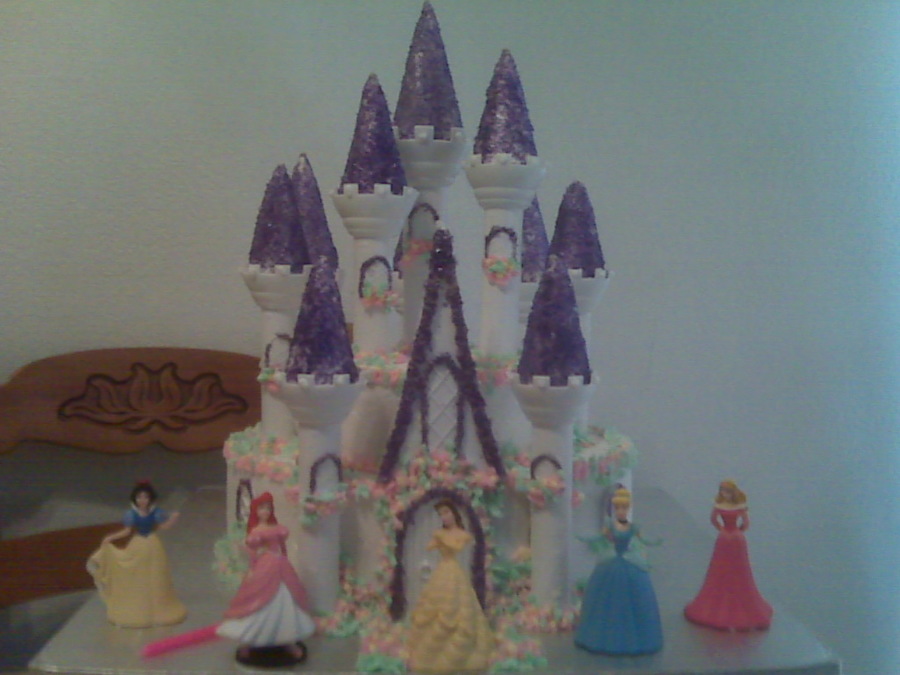 Cake is white w/butter cream frosting. tips of castel are of purple sprinkles