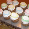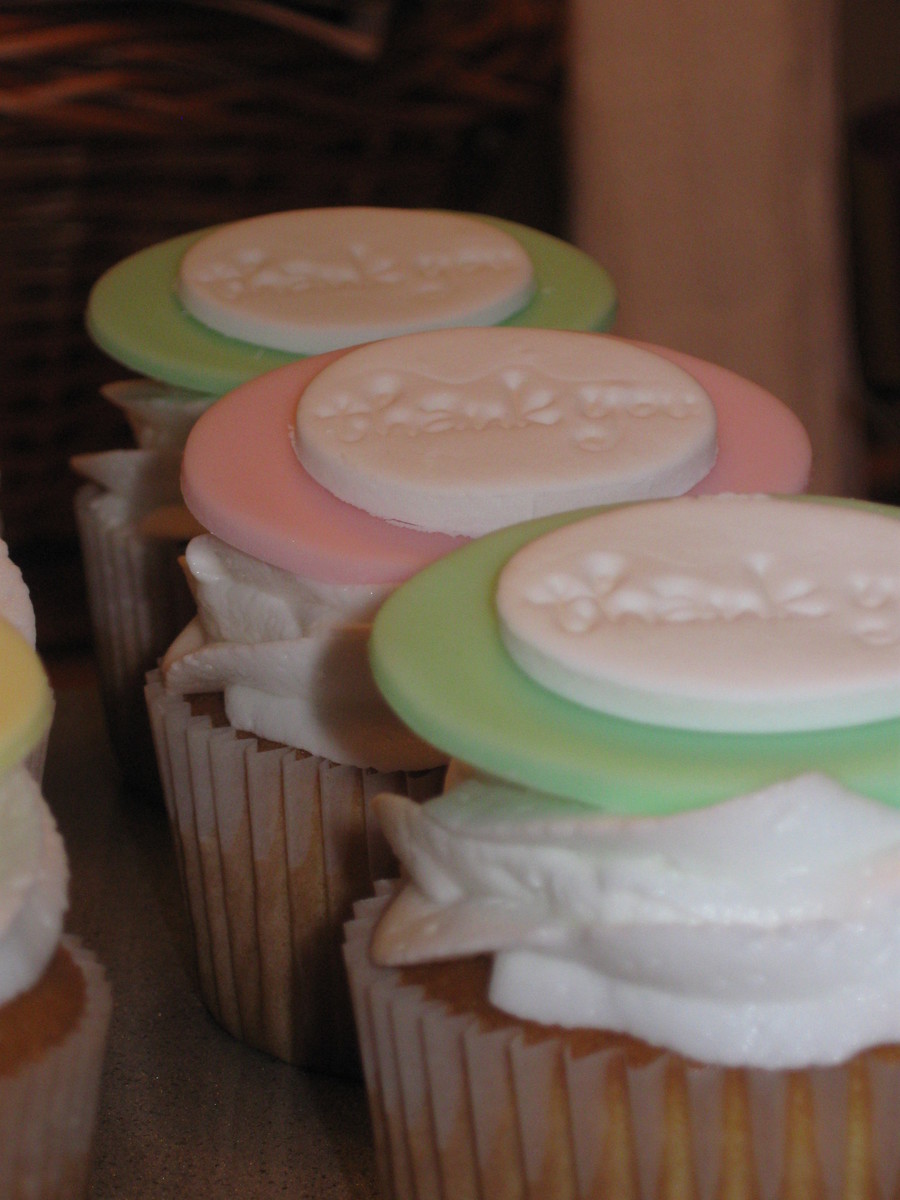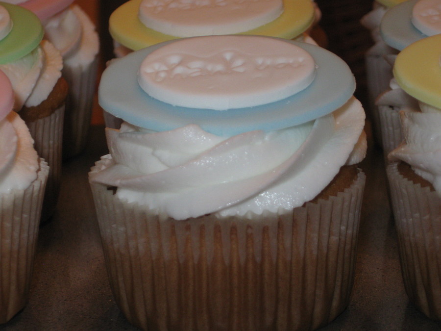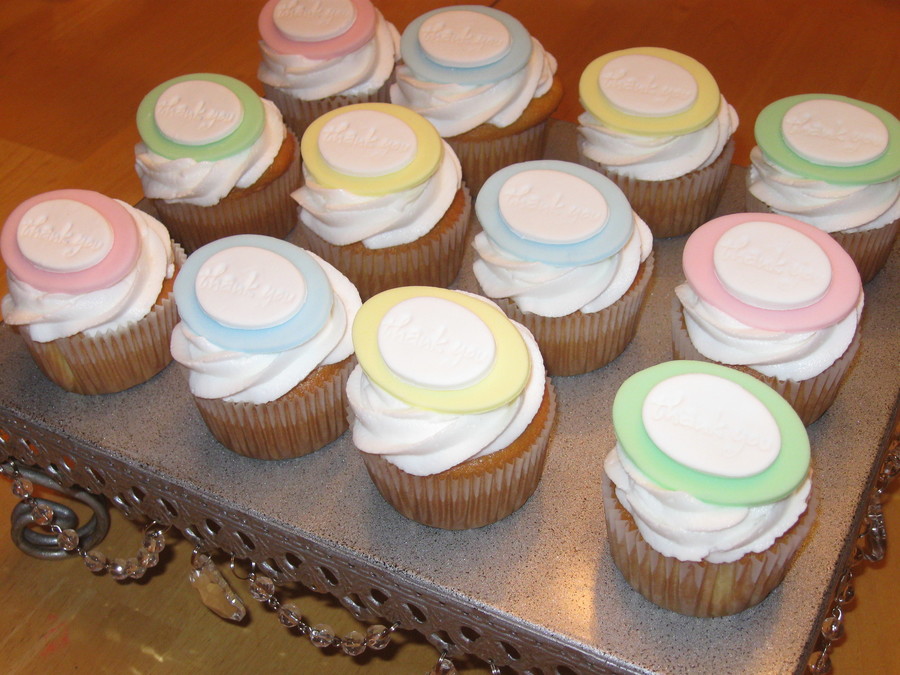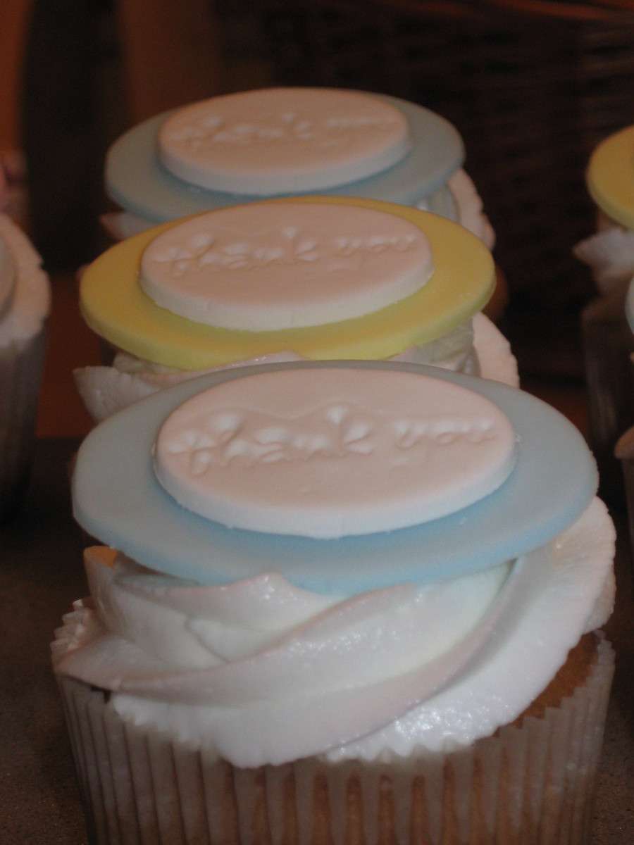 These cupcakes were done for teacher appreciation at my children's school. Yellow cake, chocolate fudge filling, vanilla butter cream swirls, then topped off by a fondant/gum paste oval imprinted with "thank you"! Each teacher received a box with one of each color topper.