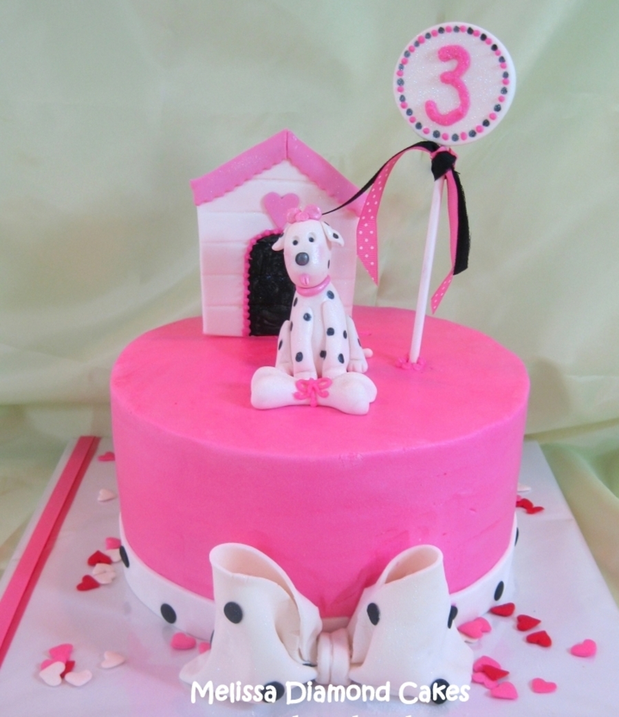 This is a 9" cake with fondant and gum paste accents---Dalmation, bow and dog house are gum paste. Thanks for looking!!